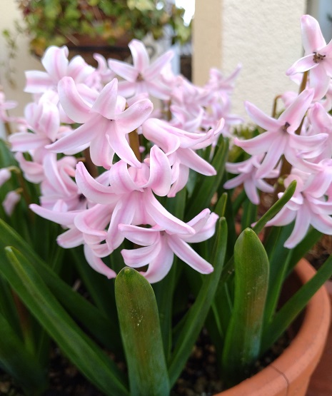 玄関の鉢植えヒヤシンスが満開でいい香りを放っています。
