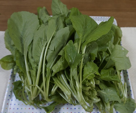 日曜日に夫が間引いて帰った小松菜が、葉が柔らかくまだ色も濃くなっていないけど